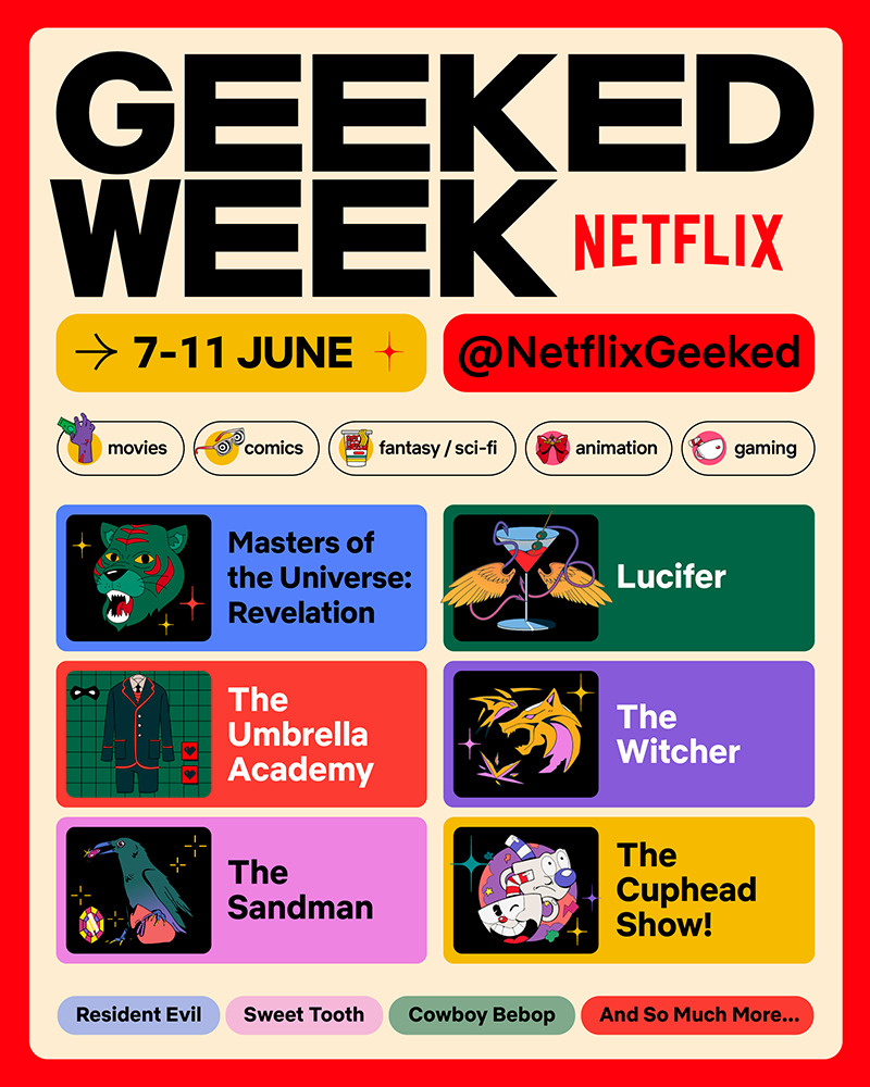 “La primera Geeked Week tendrá lugar entre el 7 y el 11 de junio, y les regalará a los fans una gran variedad de exclusivas, nuevos tráileres, arte en vivo, participaciones de las principales estrellas y mucho más sobre sus series y películas favoritas de Netflix.